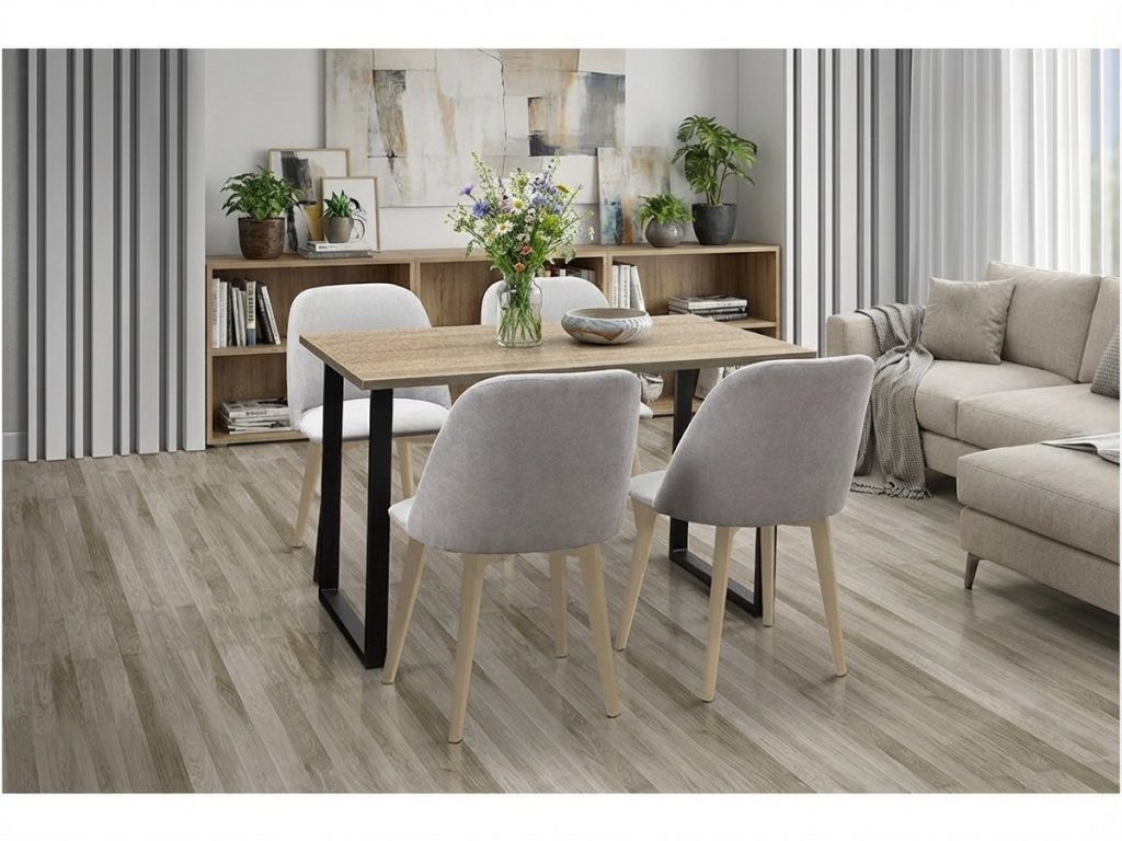 Jídelní set se skládá ze stolu o rozměru 120x80 cm s kovovými nohami a čtyř židlí z masivního dřeva v kombinaci s čalouněným sedákem. Tento jídelní set se stane středobodem vaší jídelny.