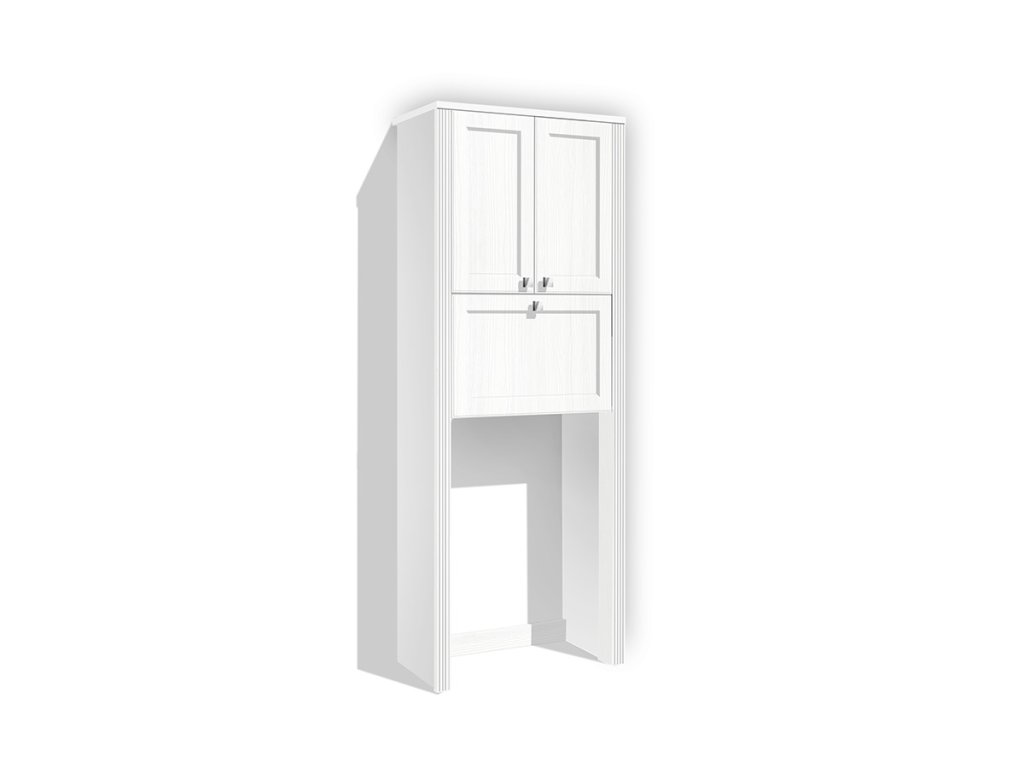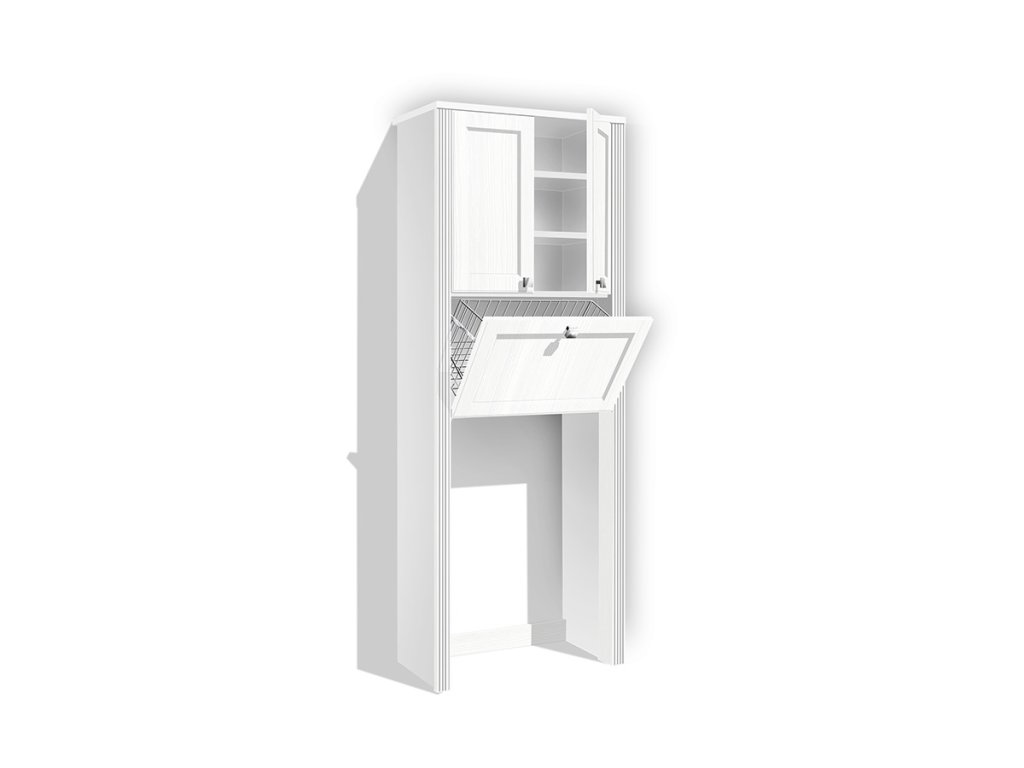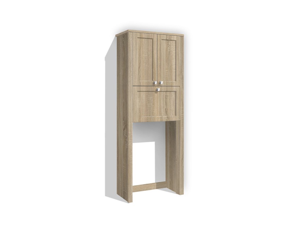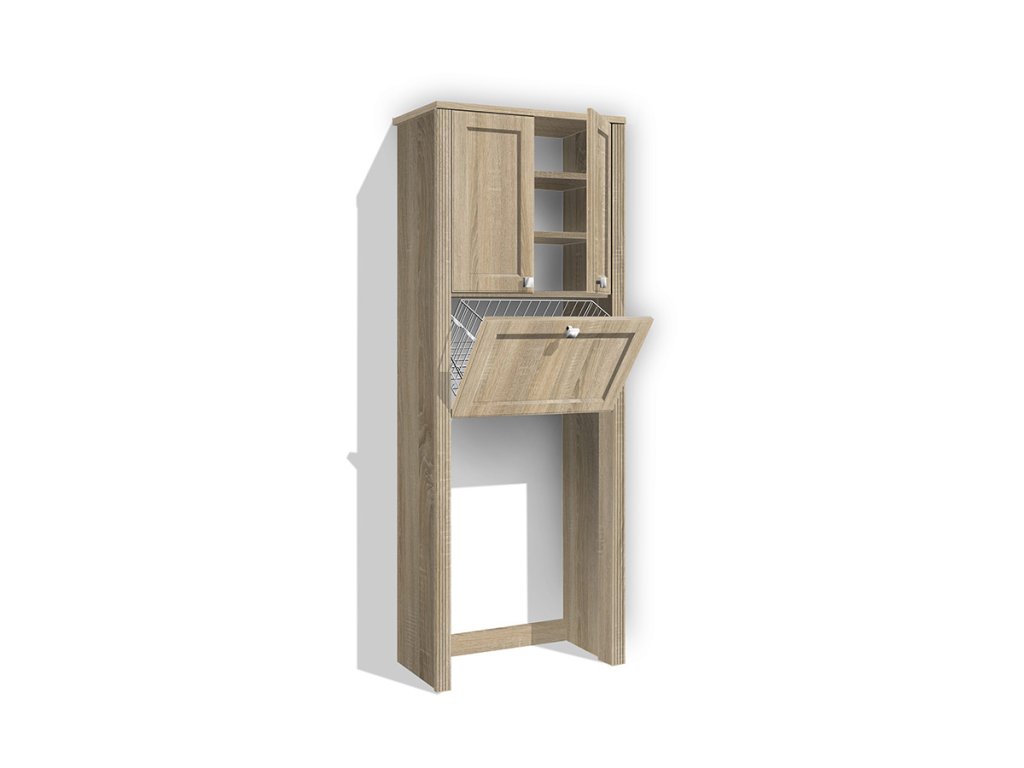 Vysoká koupelnová skříňka se skládá z policového úložného prostoru, kde je možno výšku polic nastavit dle potřeby a který je uzavíratelný dvířky. Dále má zabudovaný výklopný drátěný koš, který je také uzavíratelný sklopnými dvířky. Dvířka jsou opatřena kovovými úchytkami. Lisované MDF dvířka v kombinaci s pilastrem dodávají skříňce efektní vzhled. Skříňka je vyrobena z lamino desek o tloušťce 18 mm (nikoli 16 mm).