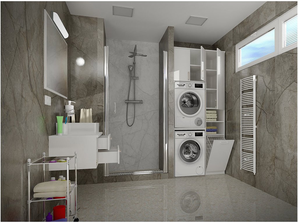 Koupelnovou skříňku lze vyrobit také zrcadlově (skříňka vlevo, prostor pro pračku a sušičku vpravo), napište nám to při objednání do poznámek.