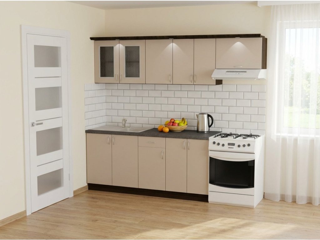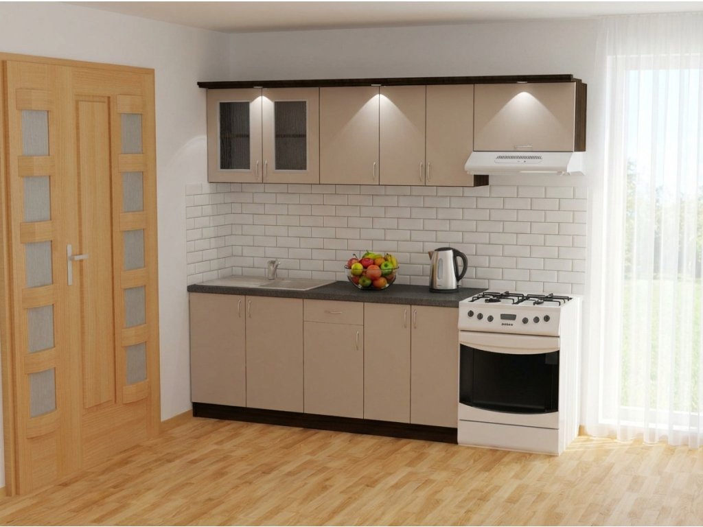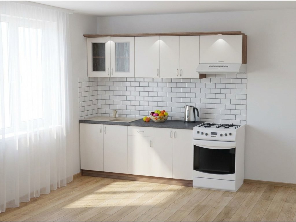 Jednotlivé skříňky jsou dodávány složené, vč. dvířek a úchytek. Snadná instalace, stačí je ustavit na místo. Závěsná lišta na horní skříňky je v ceně, stejně jako pracovní deska s těsnícími lištami a koncovkami. Vše připraveno, nařezáno a olepeno.