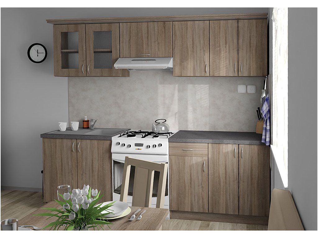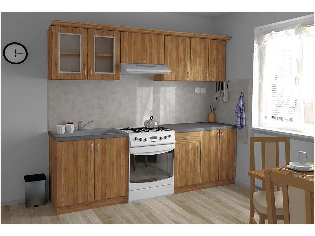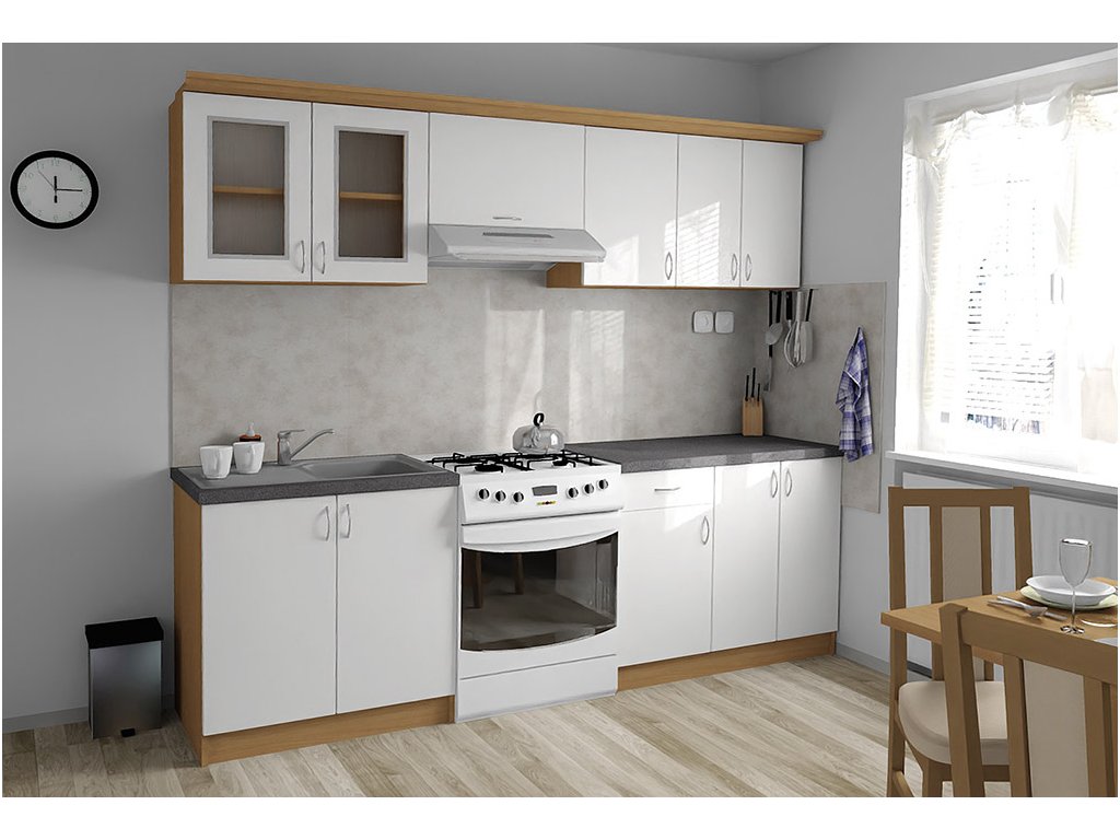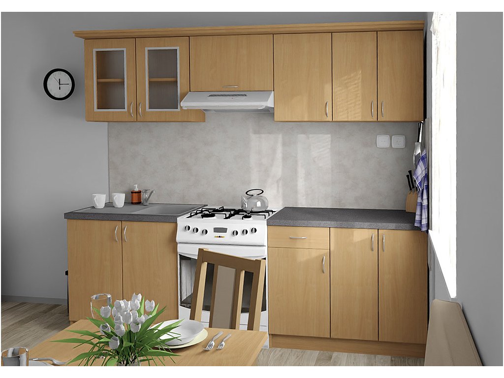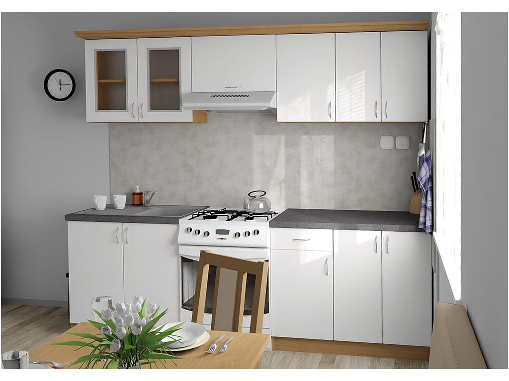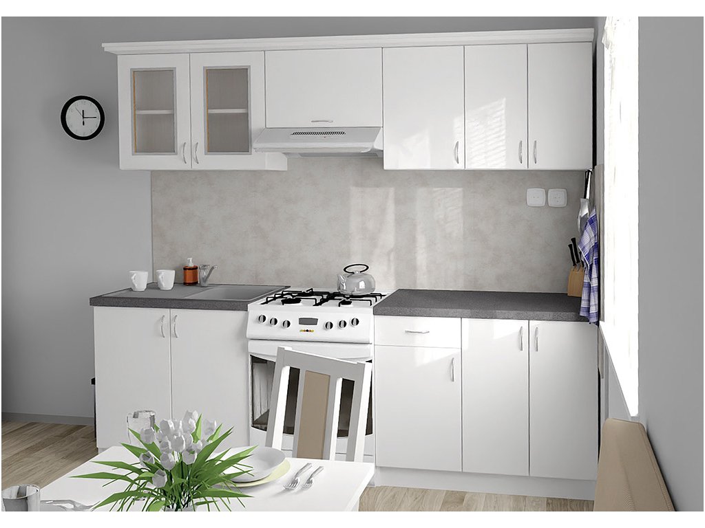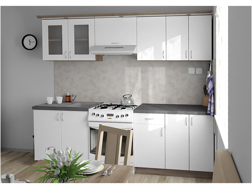 Jednotlivé skříňky jsou dodávány složené, vč. dvířek a úchytek. Snadná instalace, stačí je ustavit na místo. Závěsná lišta na horní skříňky je v ceně, stejně jako pracovní deska s těsnícími lištami a koncovkami. Vše připraveno, nařezáno a olepeno.