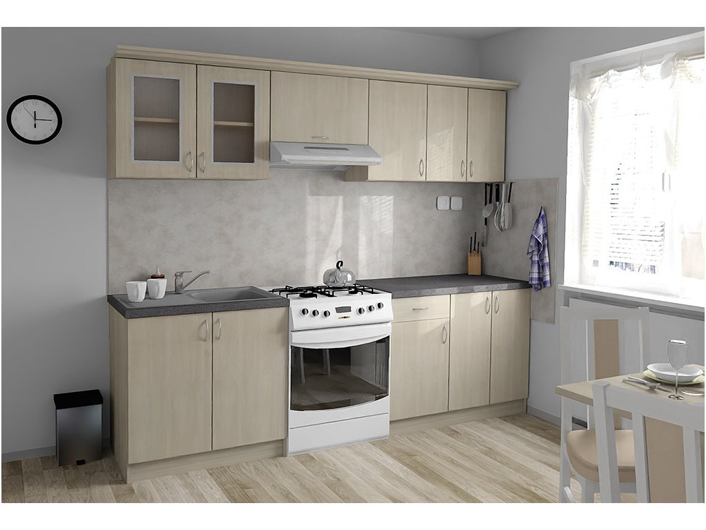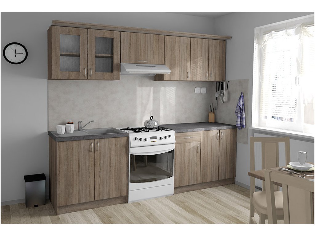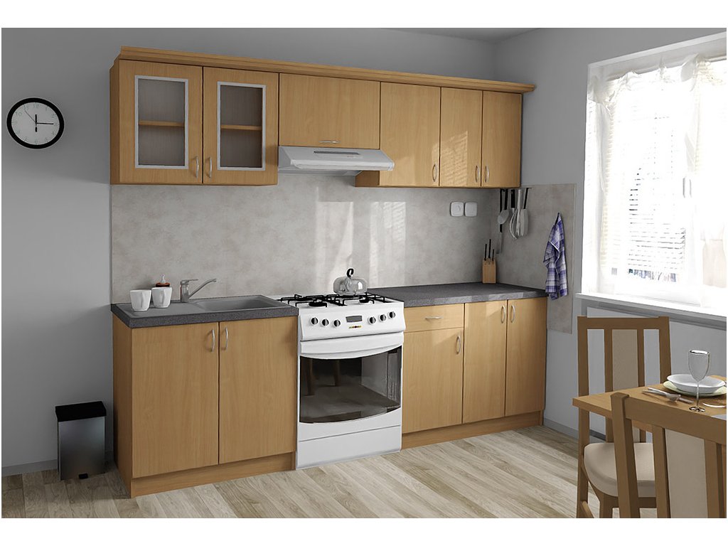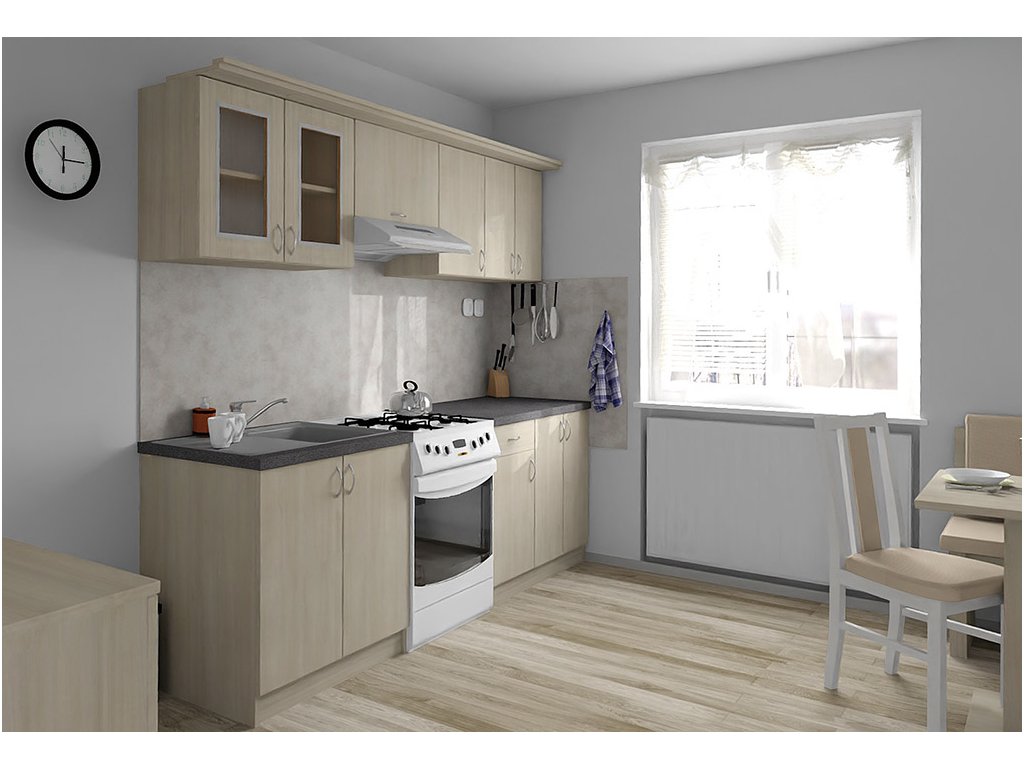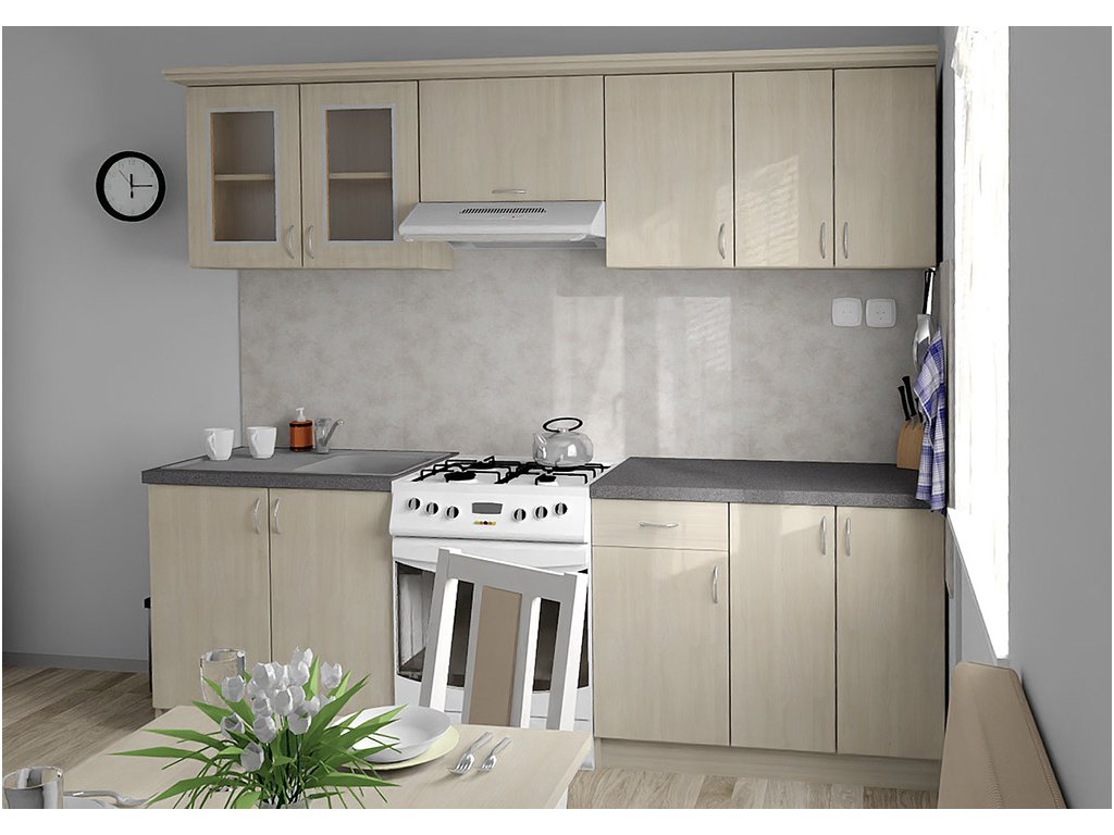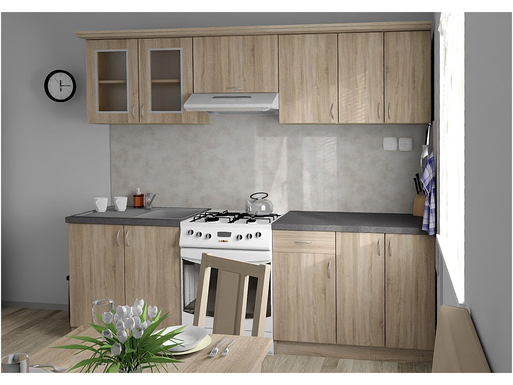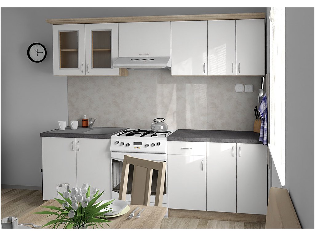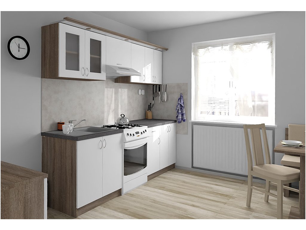 Jednotlivé skříňky jsou dodávány složené, vč. dvířek a úchytek. Snadná instalace, stačí je ustavit na místo. Závěsná lišta na horní skříňky je v ceně, stejně jako pracovní deska s těsnícími lištami a koncovkami. Vše připraveno, nařezáno a olepeno.