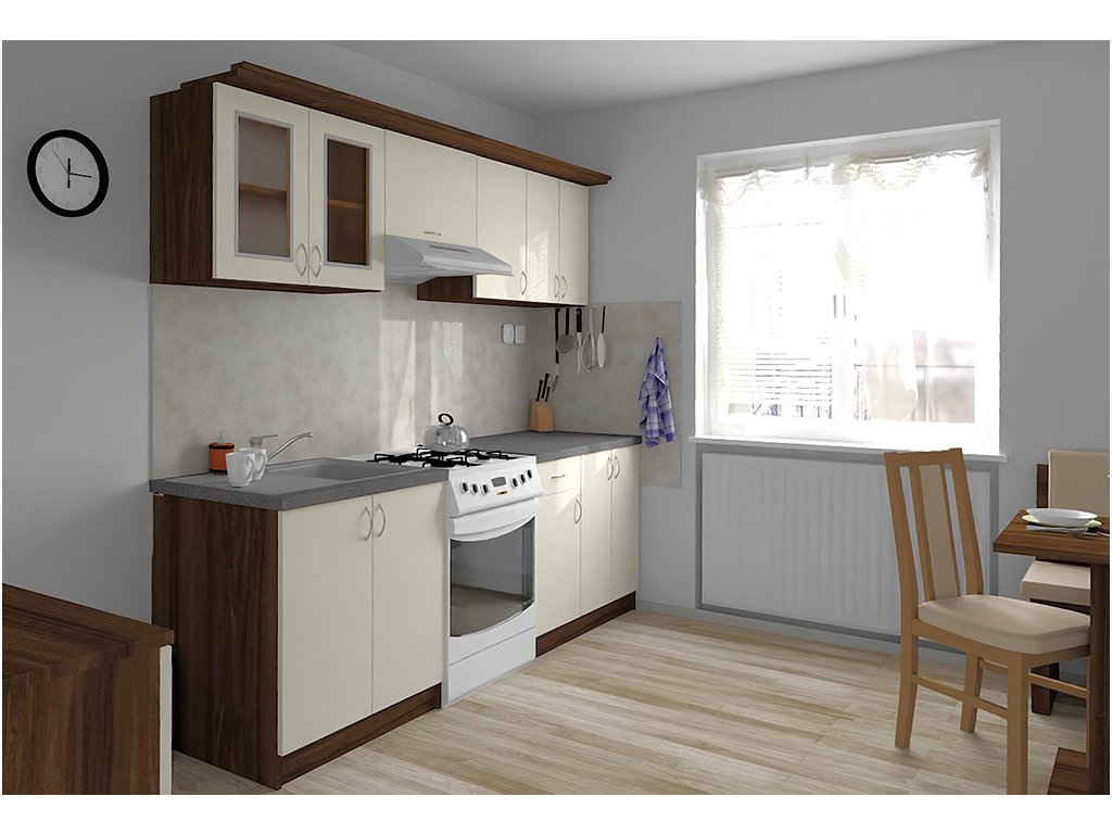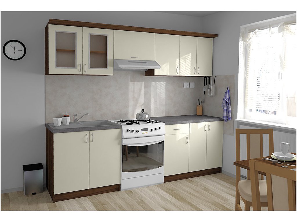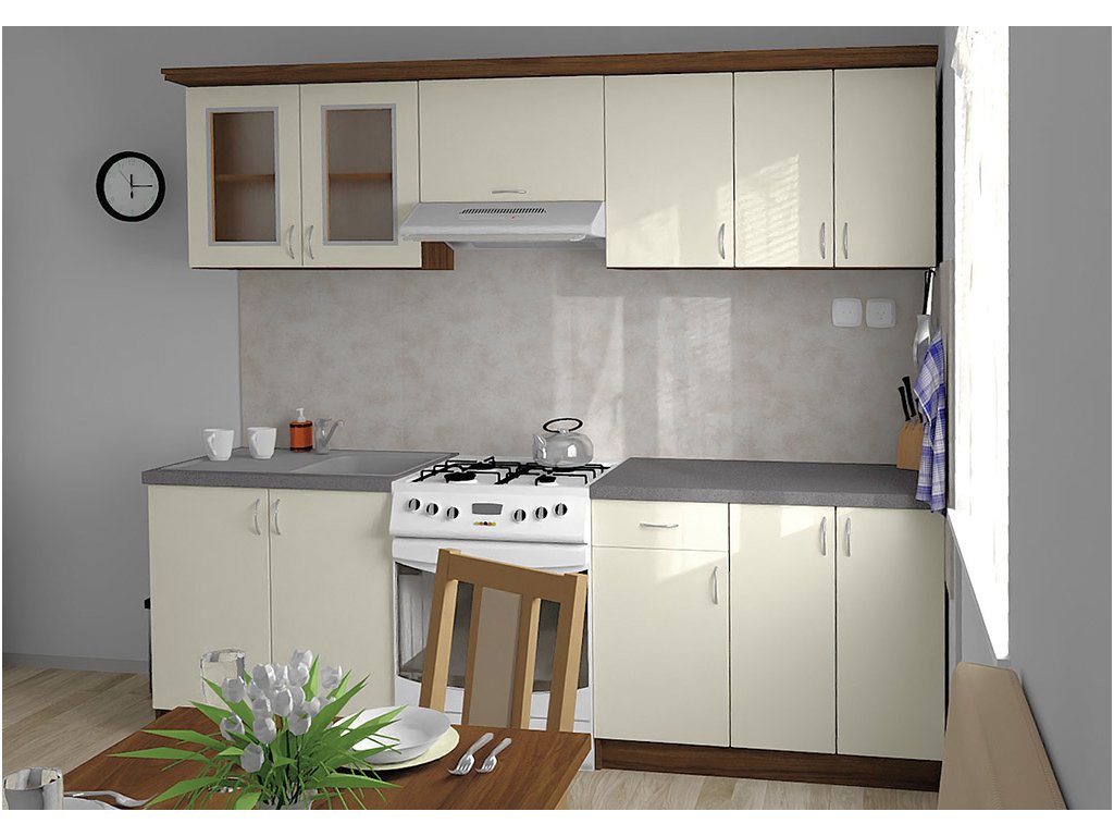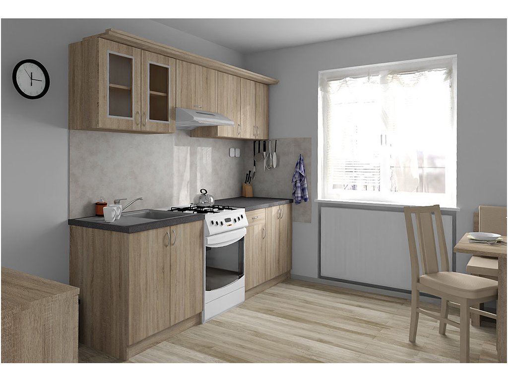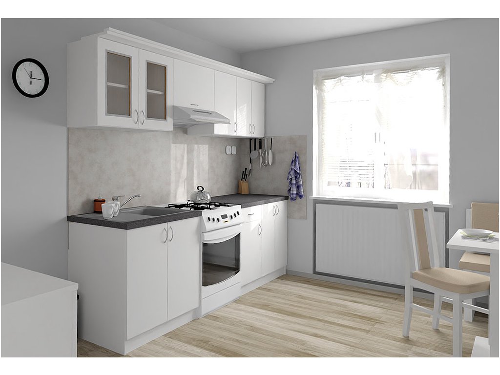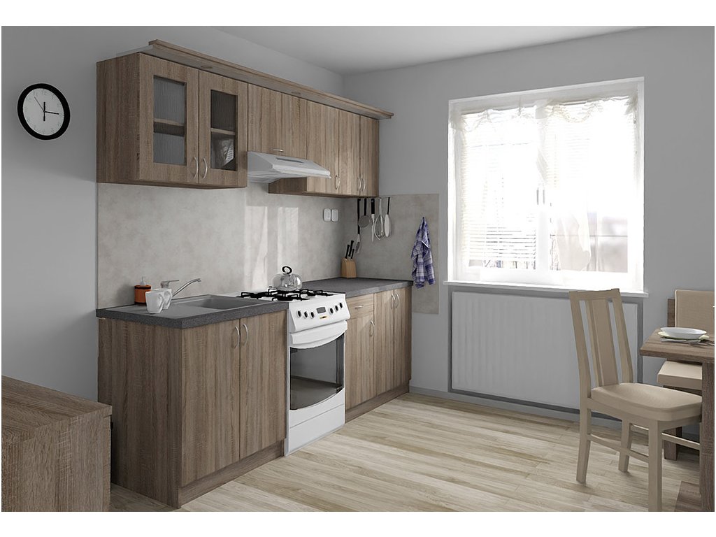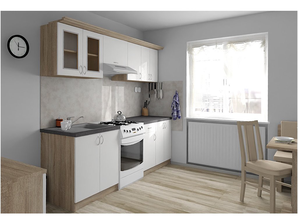 Jednotlivé skříňky jsou dodávány složené, vč. dvířek a úchytek. Snadná instalace, stačí je ustavit na místo. Závěsná lišta na horní skříňky je v ceně, stejně jako pracovní deska s těsnícími lištami a koncovkami. Vše připraveno, nařezáno a olepeno.