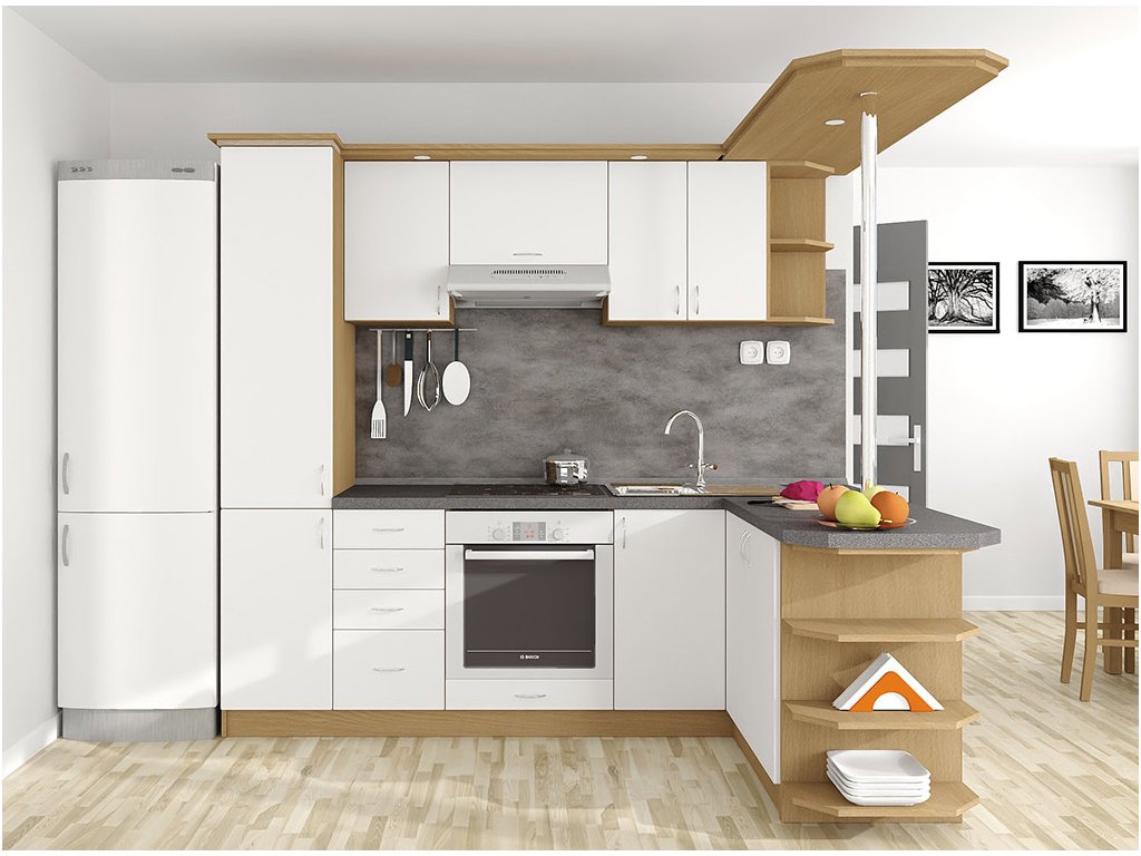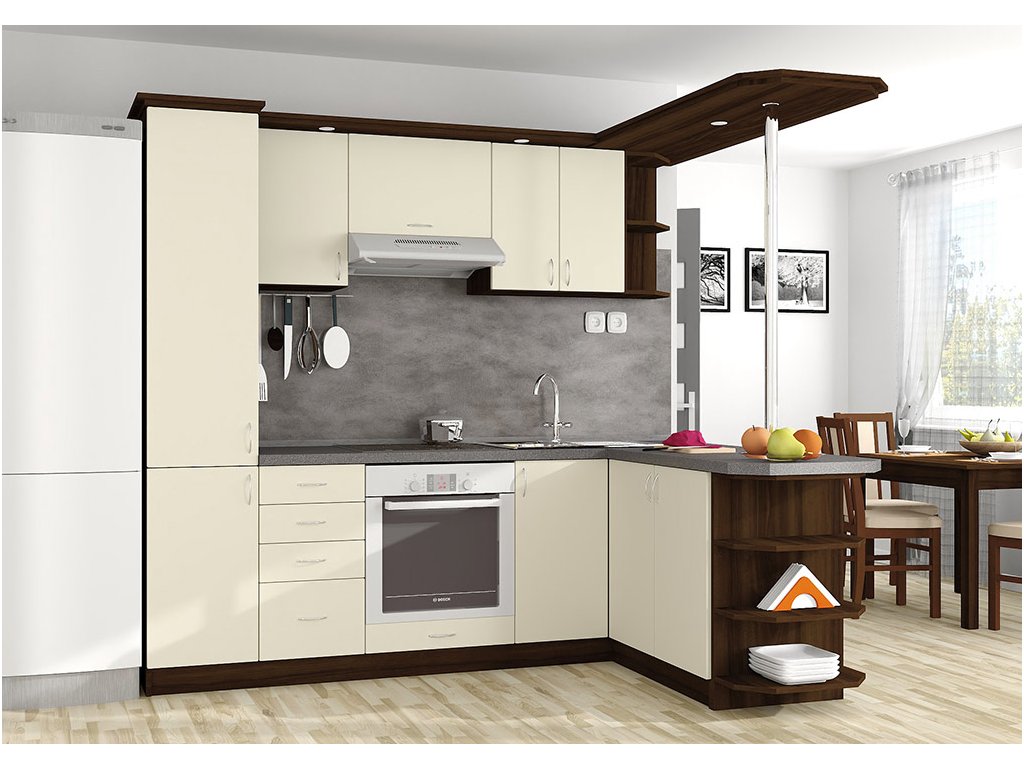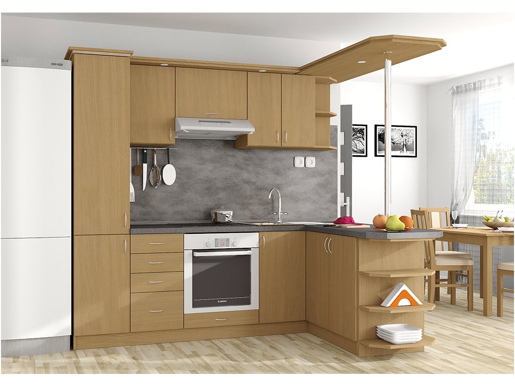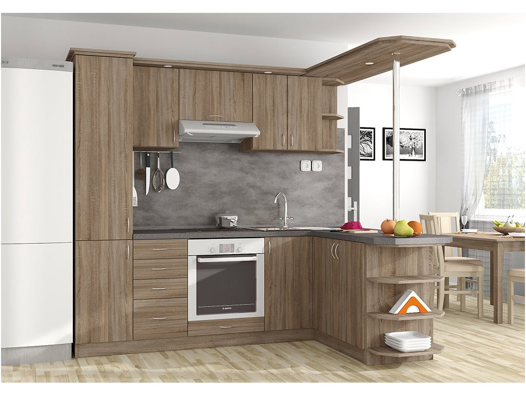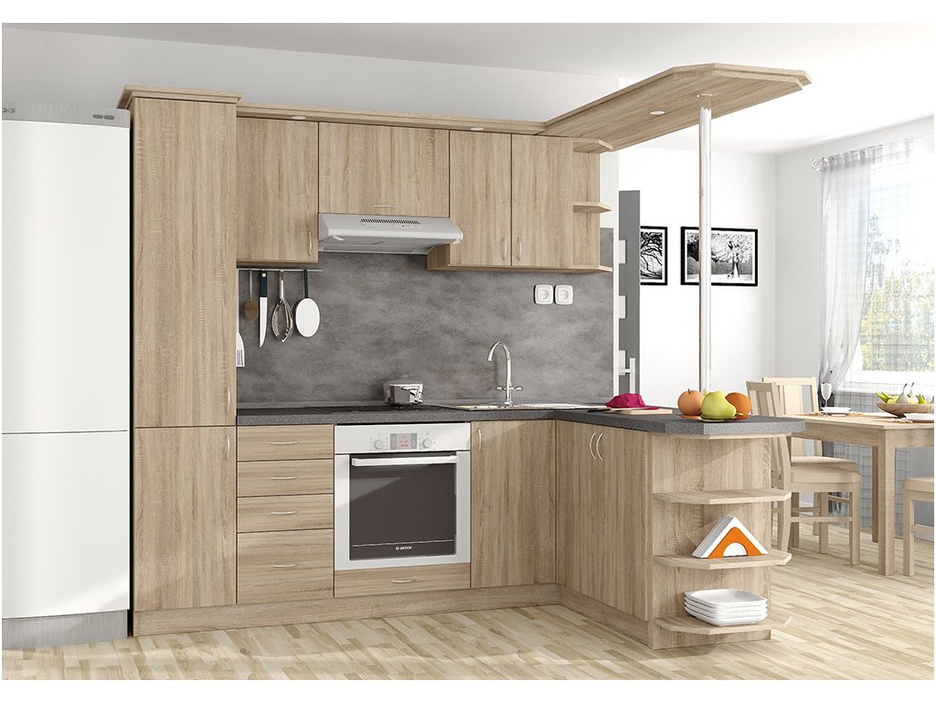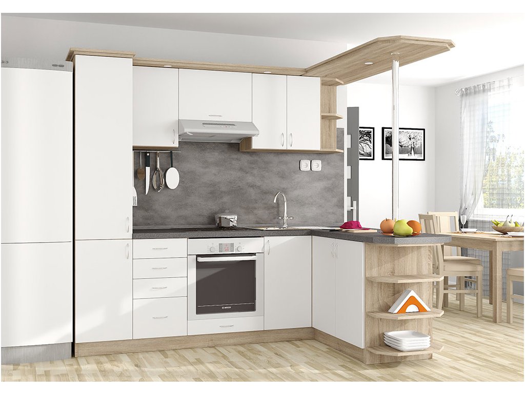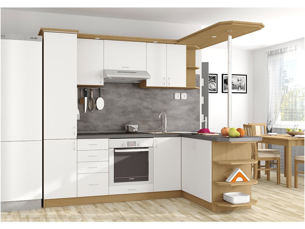 Jednotlivé skříňky jsou dodávány složené, vč. dvířek a úchytek. Snadná instalace, stačí je ustavit na místo. Závěsná lišta na horní skříňky je v ceně, stejně jako pracovní deska s těsnícími lištami a koncovkami. Vše připraveno, nařezáno a olepeno.