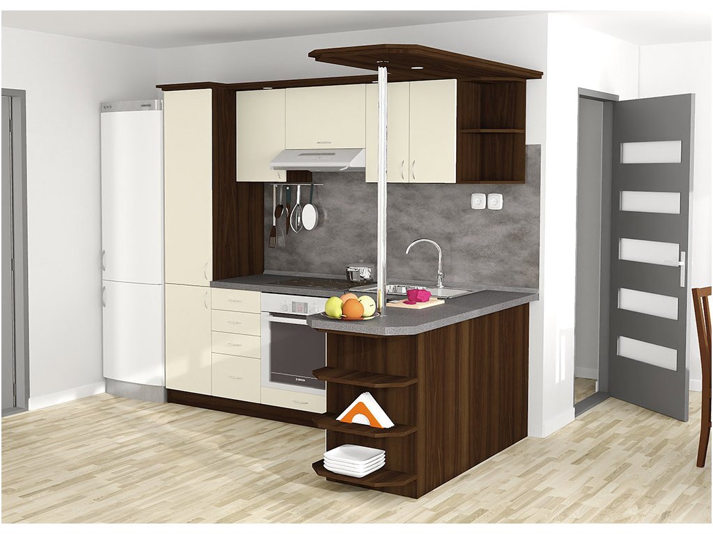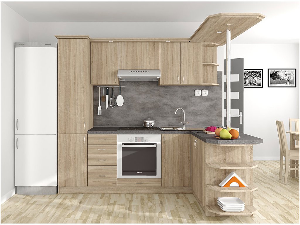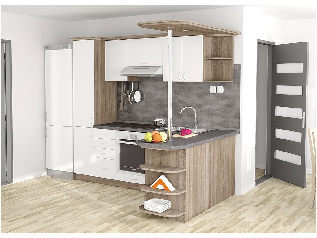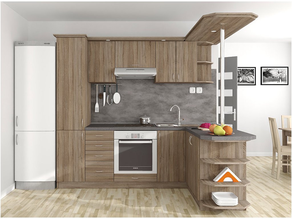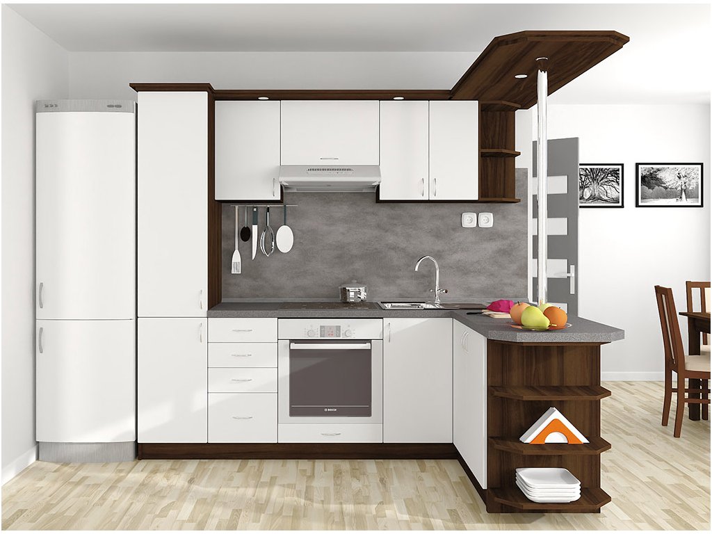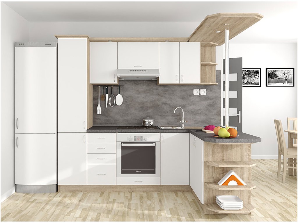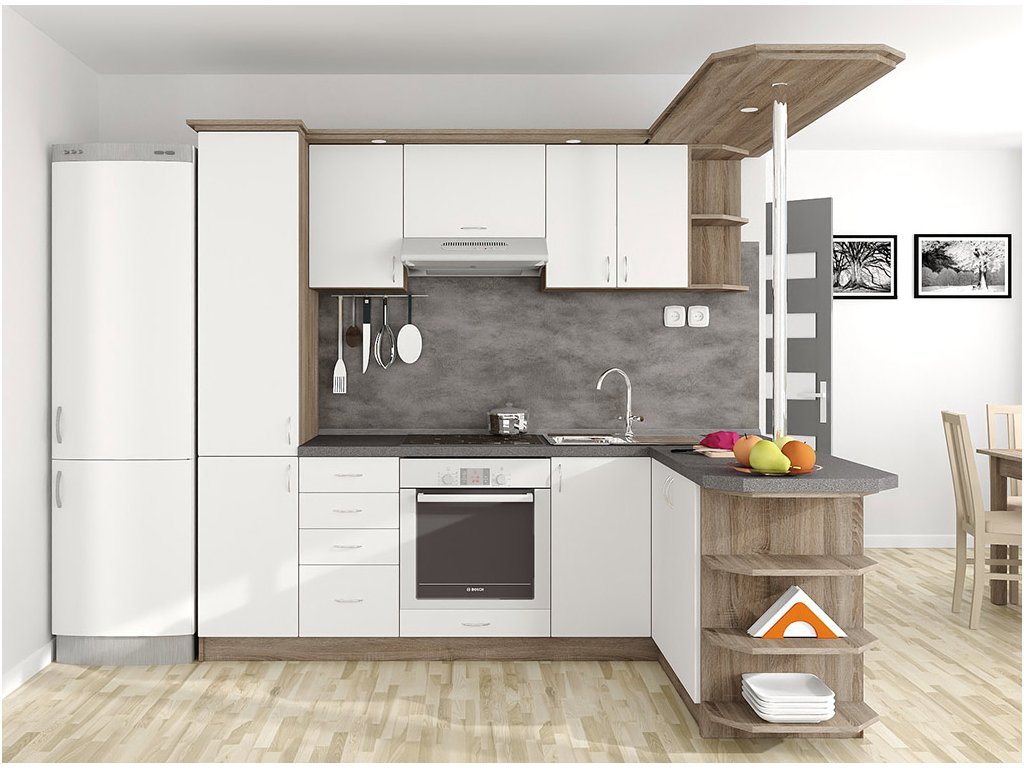 Jednotlivé skříňky jsou dodávány složené, vč. dvířek a úchytek. Snadná instalace, stačí je ustavit na místo. Závěsná lišta na horní skříňky je v ceně, stejně jako pracovní deska s těsnícími lištami a koncovkami. Vše připraveno, nařezáno a olepeno.