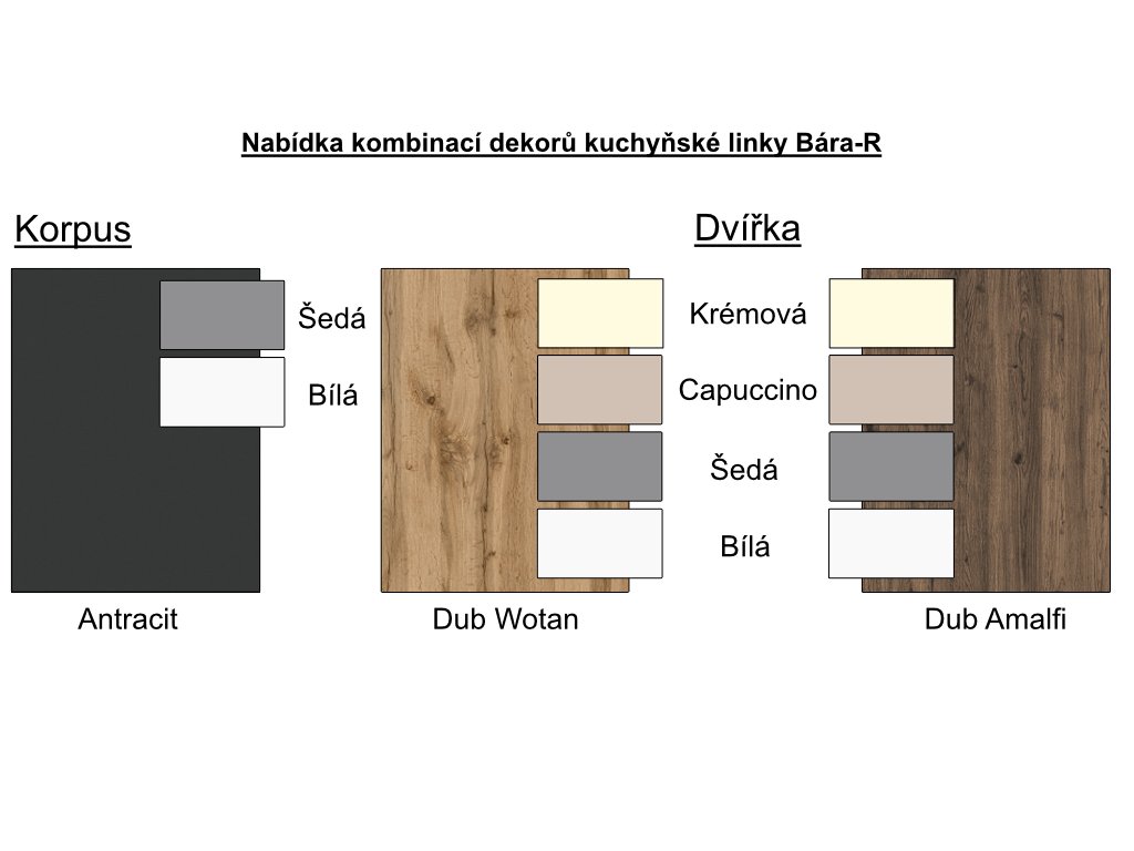 Potřebujete kuchyňskou linku Bára R v zrcadlovém provedení nebo jinou barevnou kombinaci? Stačí požadavek napsat při objednávce do poznámek. V případě nejasností se Vám ozveme.
