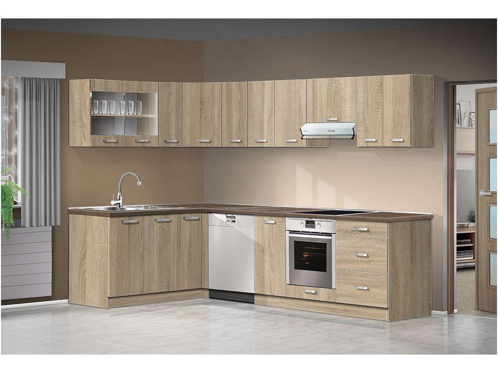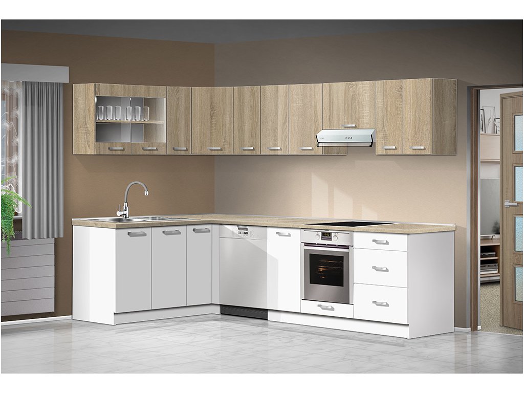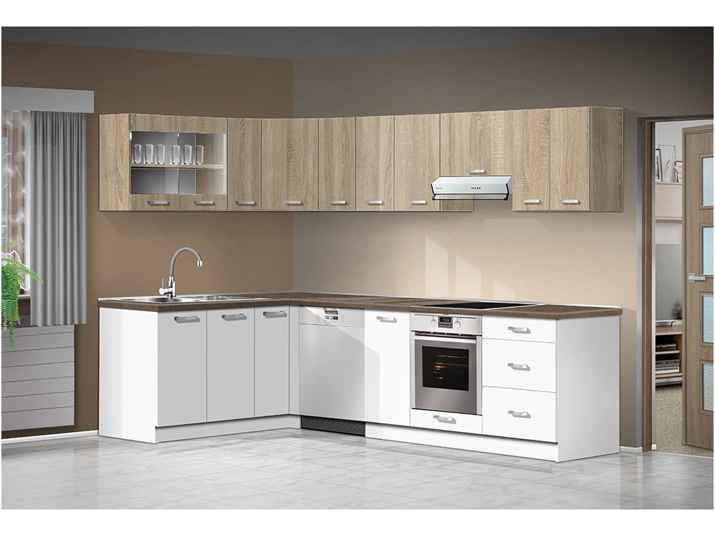 Spodní skříňky jsou na stavěcích nožkách, tl. lamina 18 mm, plastové hrany, odnímatelný sokl. U šuplíkové skříňky je v horní zásuvce příborník.