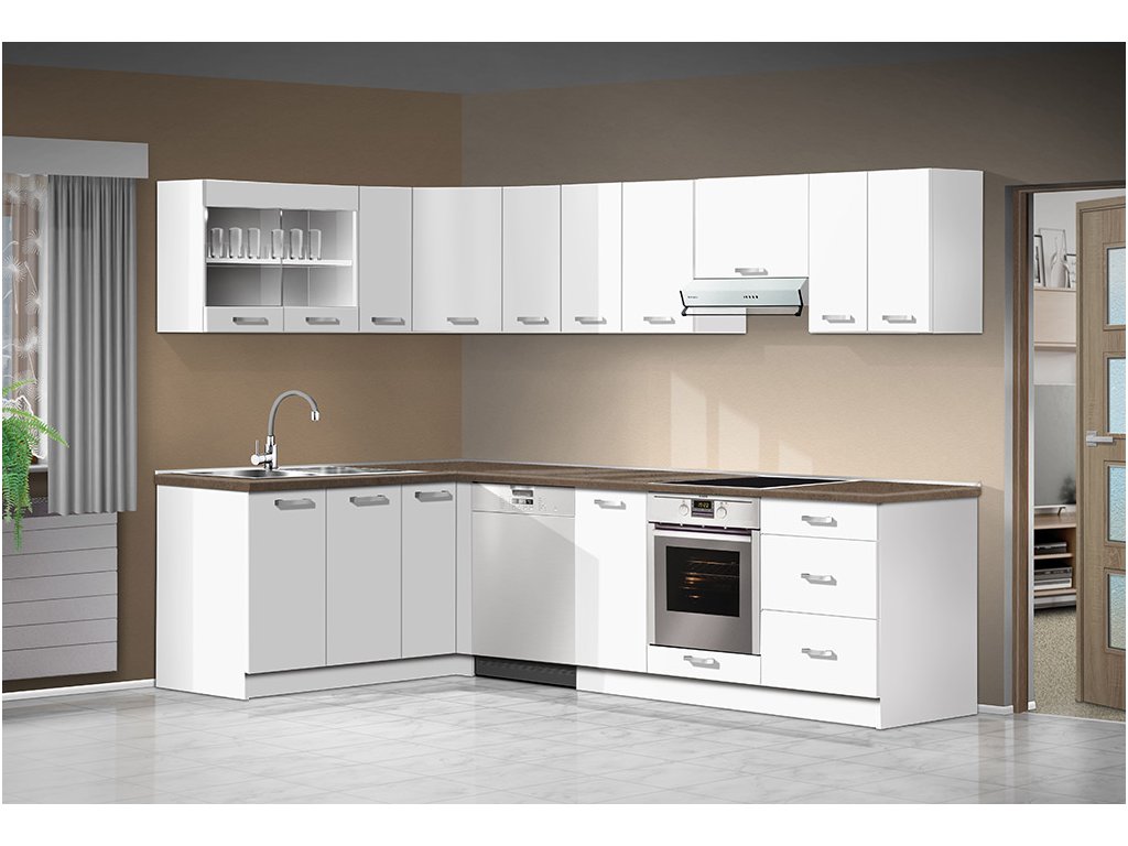 Horní skříňky kuchyňské linky jsou vyrobeny také z 18 mm lamina, plastové hrany, závěsy dvířek s tlumením dovření a dotahem, plastové úchytky v barvě chrom. Prosklené skříňky mají čiré sklo. Ocelová lišta pro zavěšení horních skříněk a spojovací kování je součástí dodávky.