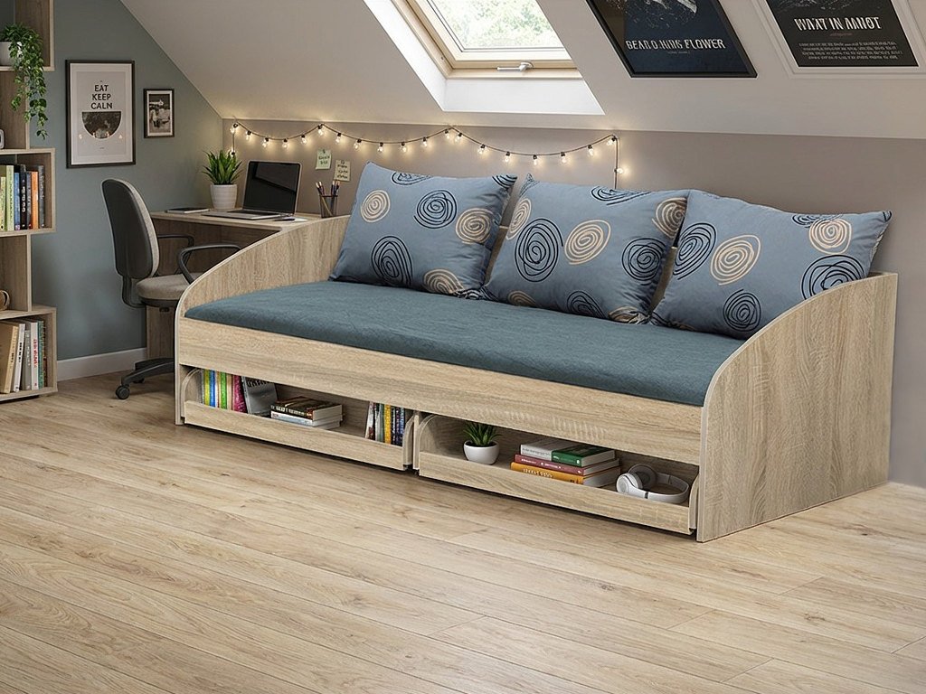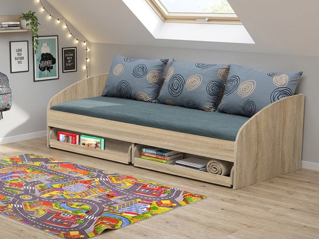 Velmi praktická válenda s kovovým rámem, svařovaným do jednoho kusu, s lamelami a s čely ze tří stran. Dvě prostorné zásuvky pro uložení lůžkovin se zajímavým madlem pro jednoduché vysunutí. Vše je vyrobeno z 18mm lamina.
