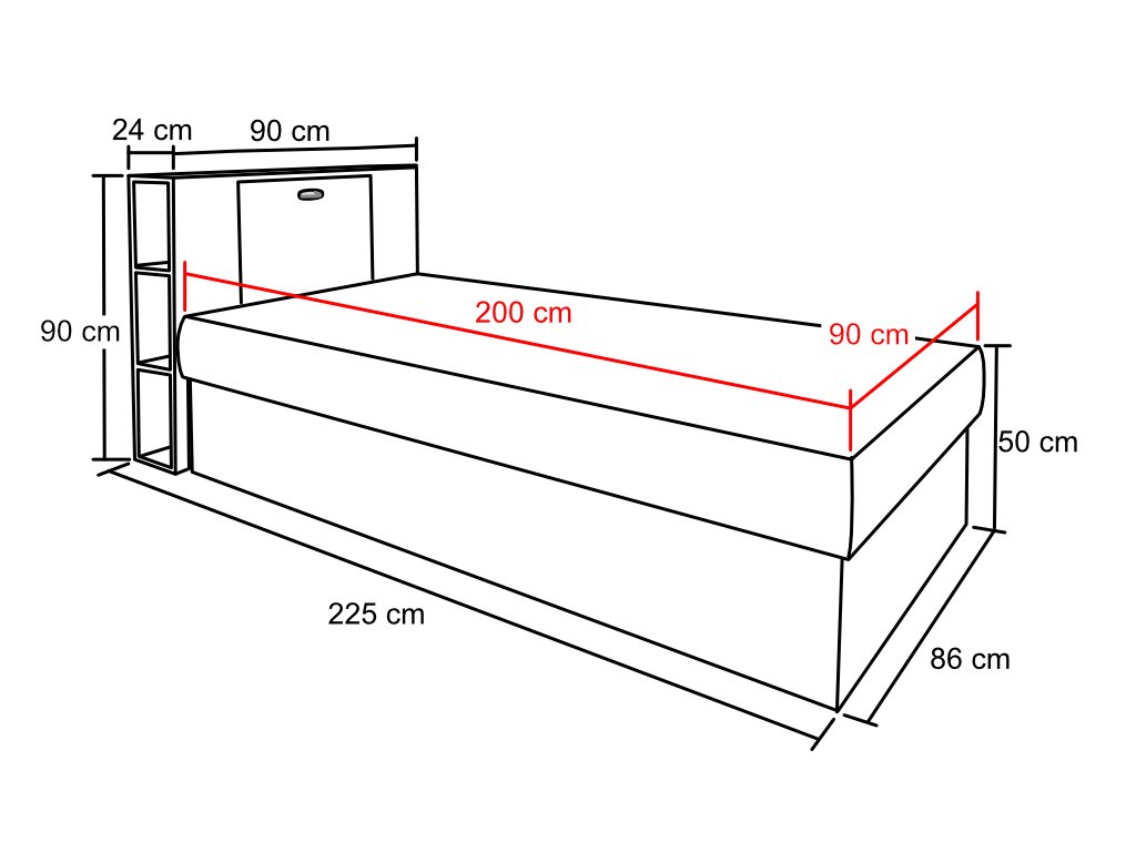 celkové rozměry postele: 90,4 x 225 x 90 cm (š x hl x v)