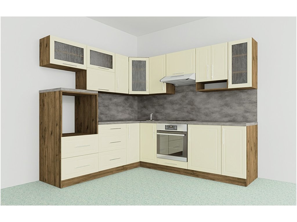 - použitý materiál lamino-Dub Amalfi, tl.18 mm, plastová hrana 0,6 mm, skříňky jsou včetně dvířek, materiál lisovaná MDF(kazeta M) béžové barvy, skleněná výplň je kůra čirá, úchytky chrom.