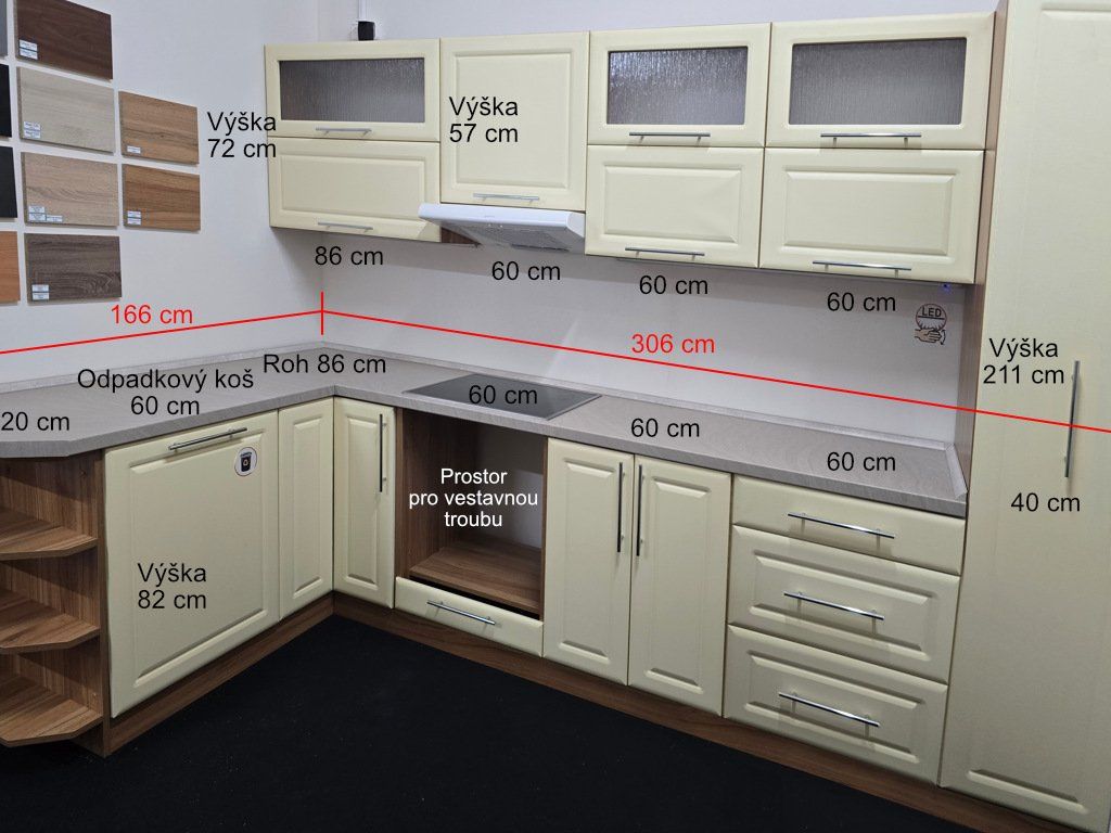 - skříňka pro troubu a digestoř je vyrobena pro běžné rozměry spotřebičů všech výrobců, elektrické spotřebiče a dřez nejsou součásti kuchyňské linky.
