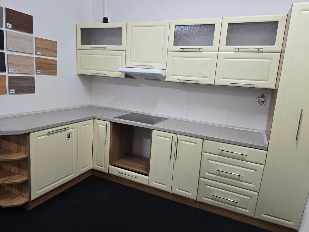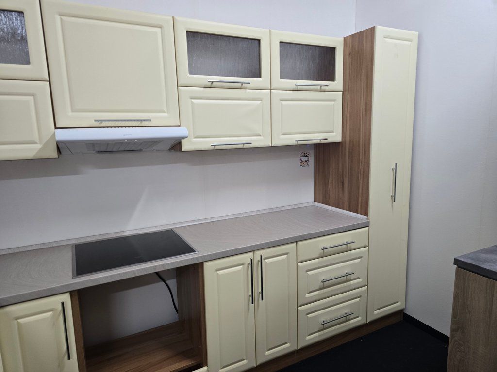 Výprodej kuchyňské linky. Linka byla vystavena v naší prodejně, aktivně nepoužívána. Dvířka jsou bez poškození.